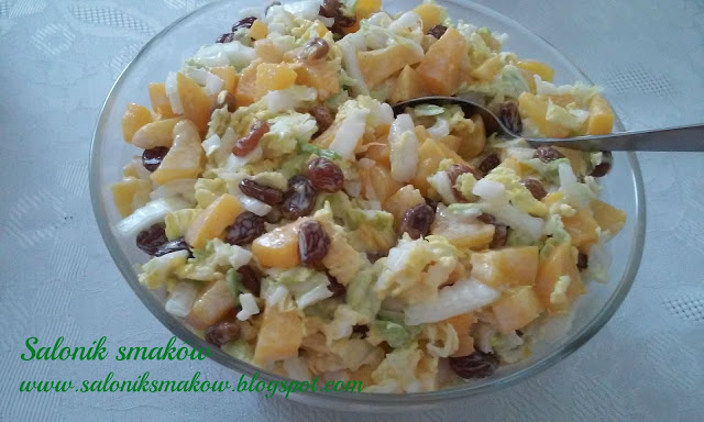 Smaczna i kolorowa sałatka z kapusty pekińskiej z dodatkiem brzoskwiń i rodzynek.…