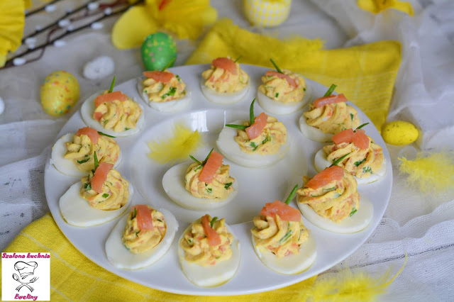 Jajka na twardo faszerowane masą z żółtka, delikatnym wędzonym łososiem, wyrazistym ostrym…