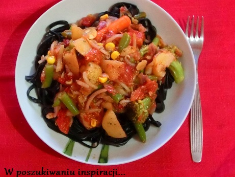 Coś dla wiecznie zaganianych. Makaron z atramentem z kałamarnicy, mrożone warzywa, pomidory…