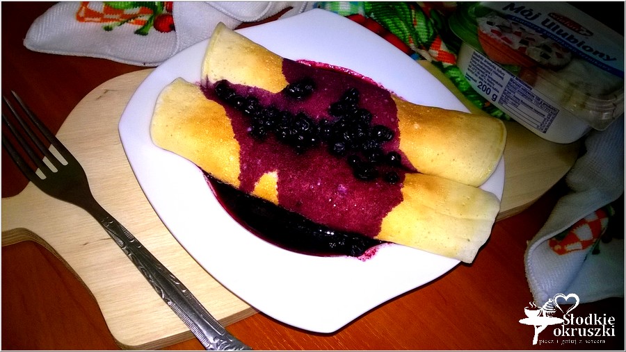 Uwielbiam naleśniki. Ten prosty placek daje tyle możliwości. Wystarczy podać go z ulubionym nadzieniem, polać owocową polewą i już mamy wyśmienity obiad dla całej rodziny. Naleśniki równie dobrze sprawdzają się również w formie kolacji. Dziś zapraszam Was na naleśniki z nadzieniem serowym polane sosem jagodowym. Jak dla mnie