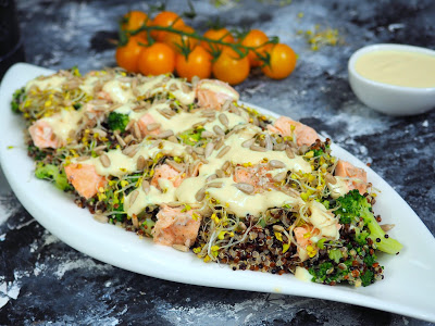 Sałatka z komosy ryżowej z dodatkiem pieczonego łososia oraz brokuła i jego…