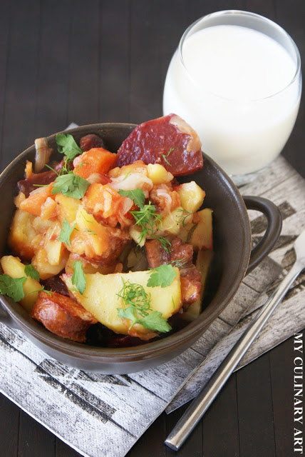 Pyszne ziemniaczki duszone z burakami, cebulą, marchewką, kiełbaską i boczkiem, podawane z kefirem. Mniam