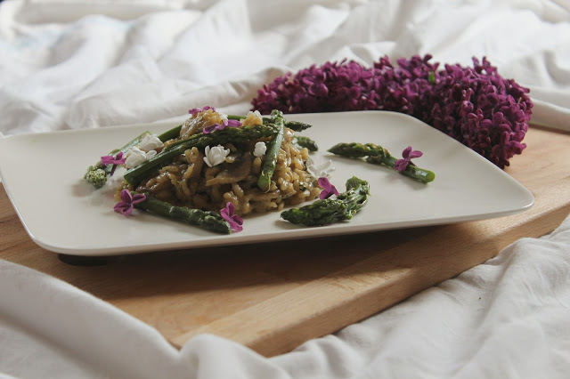 Było na słodko więc czas na coś wytrawnego i słonego, w związku, iż młode warzywa zasypują stragany i sklepowe półki dzisiaj postawiłem na młode, pachnące i kuszące pod każdym względem szparagi, a jako dodatek niezawodne risotto, dzisiaj z pieczarkami i czosnkiem, odrobiną estragonu i koprem, a to wszystko na