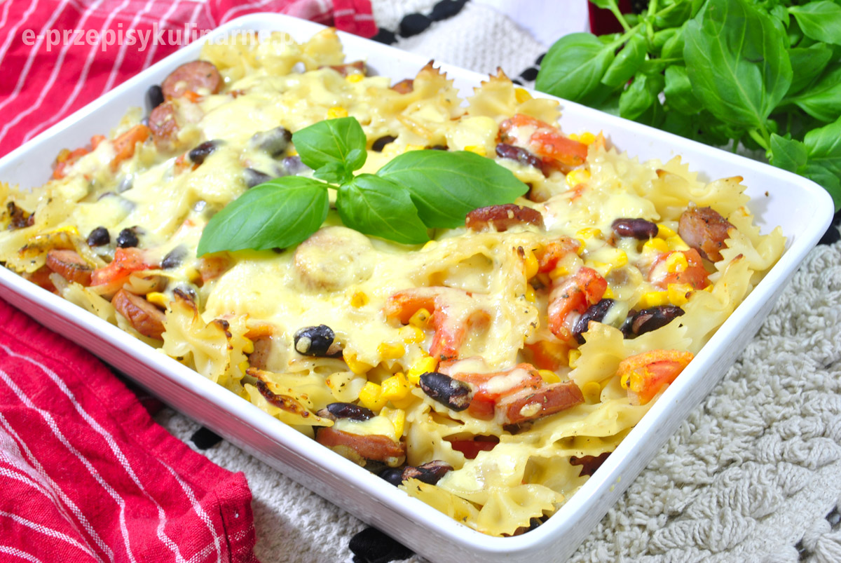 Zapiekanka makaronowa z kiełbasą i warzywami to pyszny i szybki przepis na…