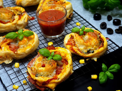 Zakręcone bułeczki z ciasta pizzowego z dodatkami aż po brzegi … szynką,…