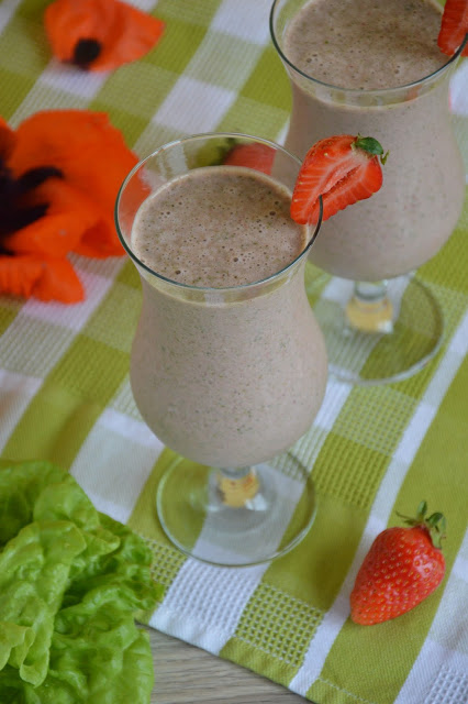 Smaczny i pożywny koktajl owocowo-warzywny. Zasmakuje nawet osobom nie lubiącym zielonych koktajli, bo truskawki i banany idealnie współtworzą smak ze szpinakiem i sałatą.