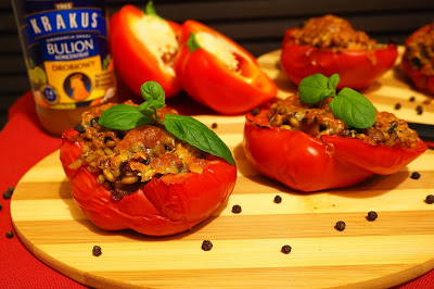 Czerwone papryki nadziewane mieszanką kaszy pęczak i zielonej soczewicy z dodatkiem kurczaka…