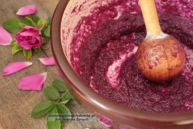 Płatki róży przepłukujemy wodą, osuszamy. Umieszczamy w makutrze, dodajemy stopniowo cukier i ucieramy na w miarę gładką konfiturę. Z płatków możemy poodrywać białe końcówki, które nadają troszkę goryczki. Do konfitury opcjonalnie dodajemy do smaku