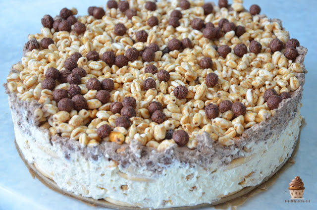 Składniki:250 g herbatników,3 szklanki płatków prażonej pszenicy,szklanka płatków kukurydzianych,szklanka płatków czekoladowe kulki,250 g mascarpone,660 ml kremówki (śmietana 30%),150 g serka naturalnego,3/4 szklanki cukru pudru,tabliczka białej czekolady,tabliczka gorzkiej czekolady,