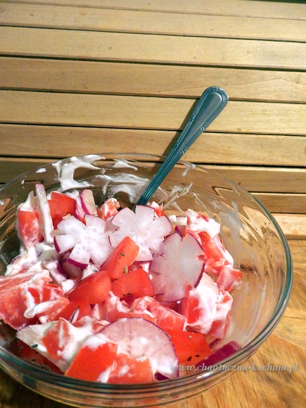 Wariacja szybkiej sałatki, którą widziałam na jednym z blogów. : ) Nie miałam potrzebnych składników ale potrzeba matką wynalazków – więc nie był to zbyt wielki problem. : )