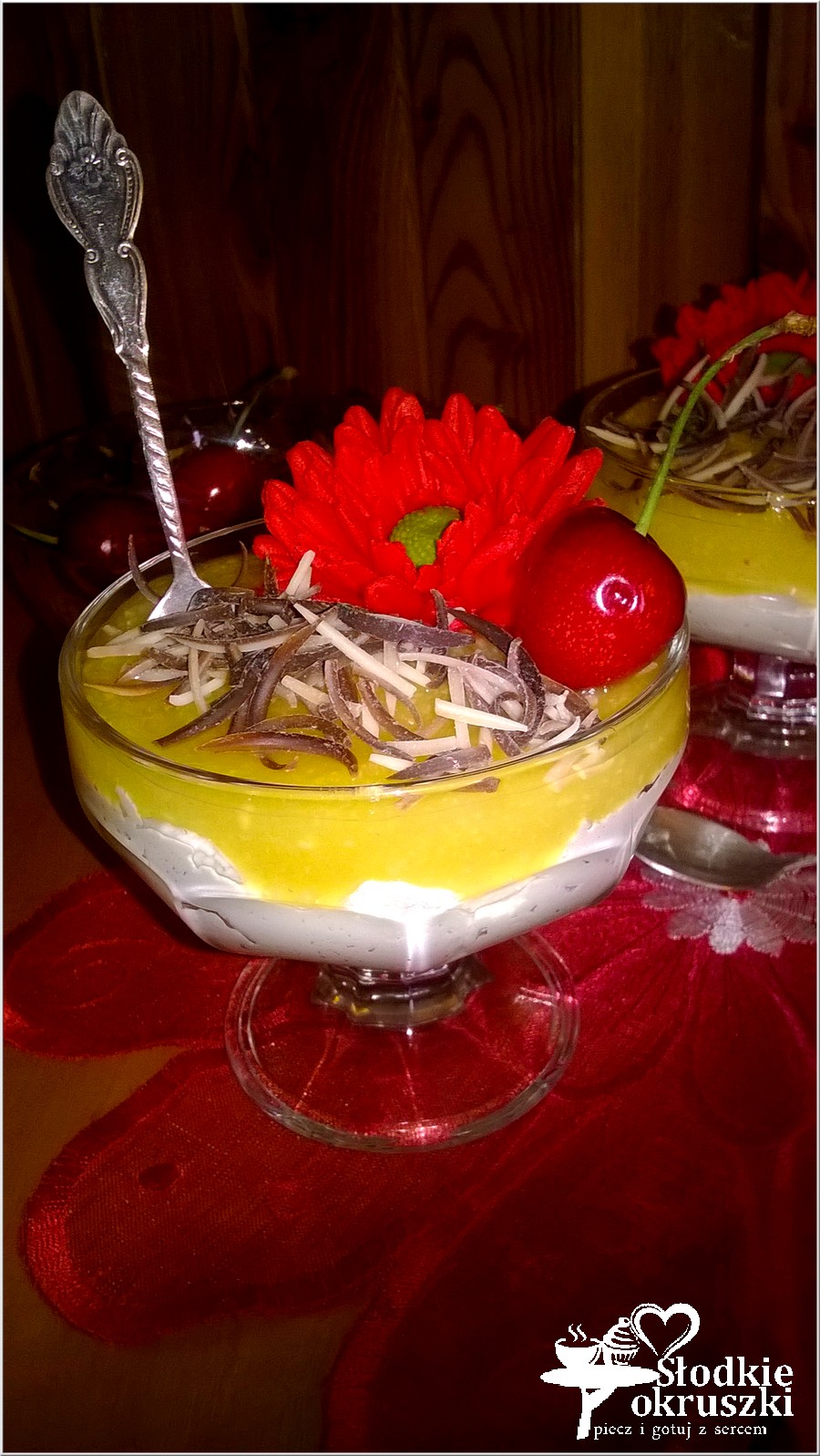Uwielbiam desery. Tak jak moja koleżanka Agnieszka. Gdy po kilku latach zadzwoniła do mnie, że jest przejazdem niedaleko mnie bardzo się ucieszyłam. Synek spał, nie mogłam wyjść do sklepu. Więc wbiegłam do kuchni i przygotowałam szybki, ale smaczny i pięknie przystrojony deser. Jak dobrze, że w