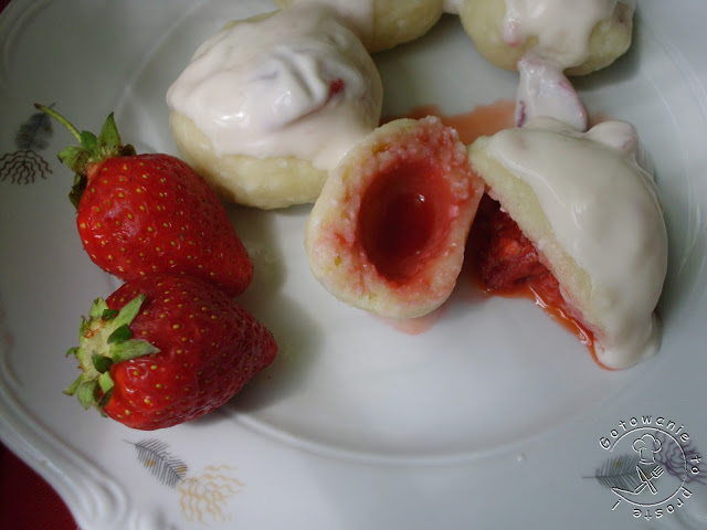 Przepis znalazłam na jednym z ulubionych moich blogów i postanowiłam go wypróbować. Knedelki nie przypadły nam za bardzo do gusty, jednak zdecydowanie wygrywają u nas pierogi z truskawkami 😉