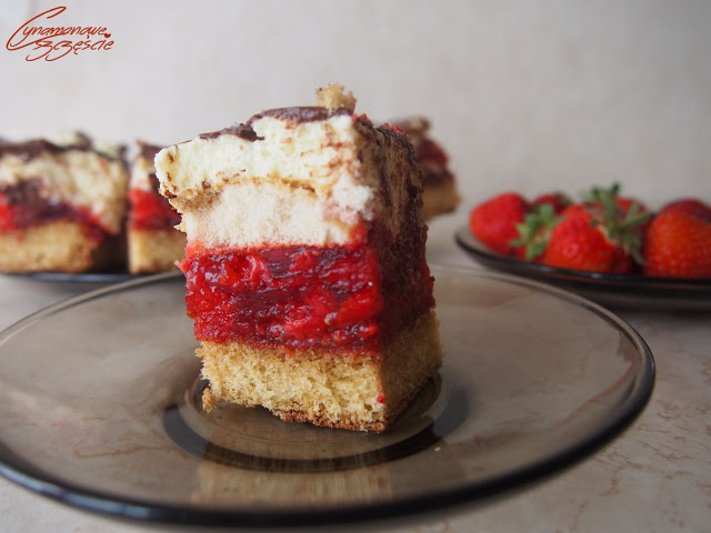 Dziś opowiem Wam bajkę i to nie byle jaką bajkę. W tej bajce delikatny biszkopt spotyka mus truskawkowy, który romansuje z kremem karpatkowym, a zazdrosne biszkopciki próbują ich rozdzielić, ale pojawia się czekolada i zgrabnie oblewa całość. 🙂