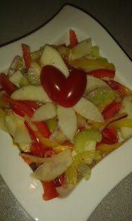 Papryka żółta– 1 strąkPapryka czerwona 1 strąkPomidory -4 sztCebula czerwona -1 sztSeler naciowy – kawałeczekGruszka -2 sztJabłko -2 sztOcet winny- 2 łyżkiOliwa -2 łyżkiSólPieprz kolorowy