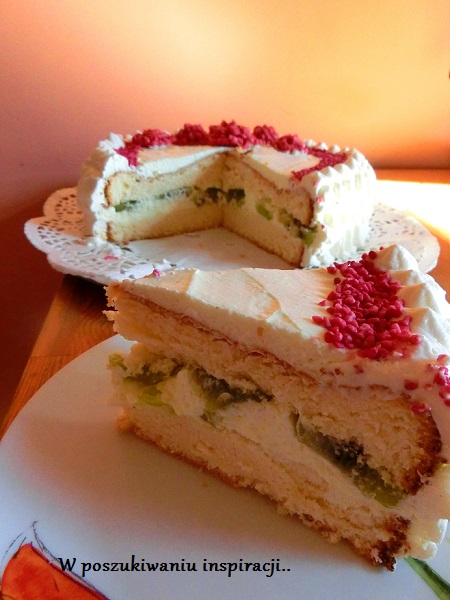 Po długiej nieobecności wracam do Was z obiecanym przepisem na nasz rocznicowy tort. Sam przepis jest banalnie prosty,a efekt zadowala nawet wybredne gusta. Muszę przyznać, że robiąc go trochę się śpieszyłam, przez co owoce zamiast bezpośrednio na biszkopcie, wylądowały na warstwie kremu. Trochę zepsuło to estetykę, ale