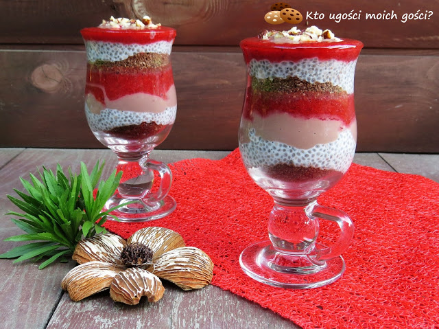 Pyszny, sycący deser i niezbyt słodki – z powodzeniem może zastąpić podwieczorek lub drugie śniadanie. Mamy tu budyń czekoladowy, mleczną warstwę z nasionami chia, zmiksowane truskawki a całości dopełniają pokruszone ciasteczka czekoladowe. Nie dość że świetnie smakuje to jeszcze ciekawie wygląda 🙂 Polecam 🙂