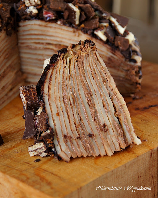Dzisiaj wyjątkowy dzień! Dokładnie rok minął od założenia bloga 🙂 Urodziny nie mogą się odbyć bez tortu, więc przygotowałam dla Was coś nietypowego… czekoladowy tort z naleśników. Rzecz jest banalnie prosta- smażycie naleśniki, po czym przekładacie je pysznym, czekoladowym kremem tworząc torcik. Wierzch polewacie polewą i dekorujecie czekoladą, wafelkami itp.