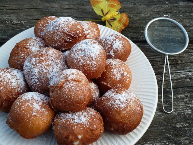 Pyszne pączki, które za sprawą nadzienia stają się wręcz doskonałe! Cały ich urok polega na tym, że są okrągłe, pomimo, że na olej trafiają z łyżki (okrągłej) i w formie kleksa (zaskoczyło mnie to, a jednocześnie zachwyciło!). Ciasto robi się w czasie rozgrzewania tłuszczu-dla niezapowiedzianych gości