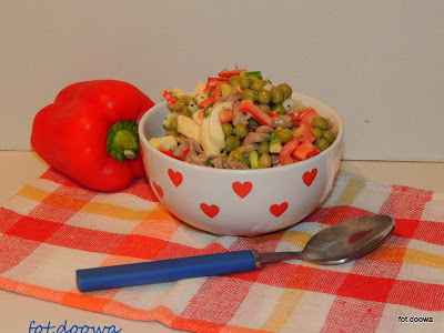 Przepis na warstwową sałatkę okolicznościową z porem, cebulą i kurczakiem, oraz chrupiącym…