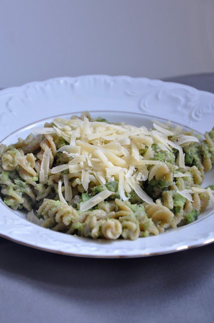 Makaron ugotować. Czosnek obrać i przecisnąć przez praskę, dodać do