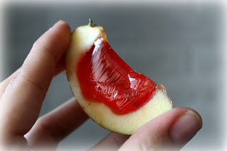 Jabłka przeciąć na połówki, wydrążyć, przelać galaretkę i odstawić do wystygnięcia, a