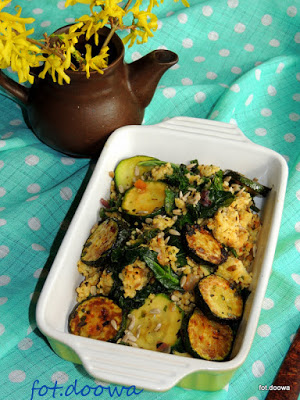 Cukinię grillowałam na patelni grillowej a jarmuż kupiłam porwany, umyty więc było bardzo szybko.