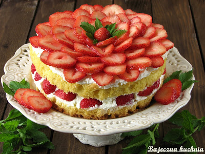 Pyszny torcik z bitą śmietaną i truskawkami, przygotowałam go w małej formie od firmy