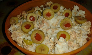 Ryż – 100 gTuńczyk w oleju – 1 puszkaOliwki zielone – 10 sztCytryny – 1/2 sztOliwa -1/2 łyżeczkiMajonez -1 łyżkaJogurt naturalny – 1 łyżkapieprzsól