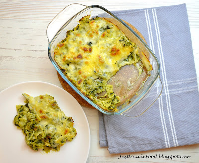 Zapiekanka makaronowa ze szpinakiem i boczkiem