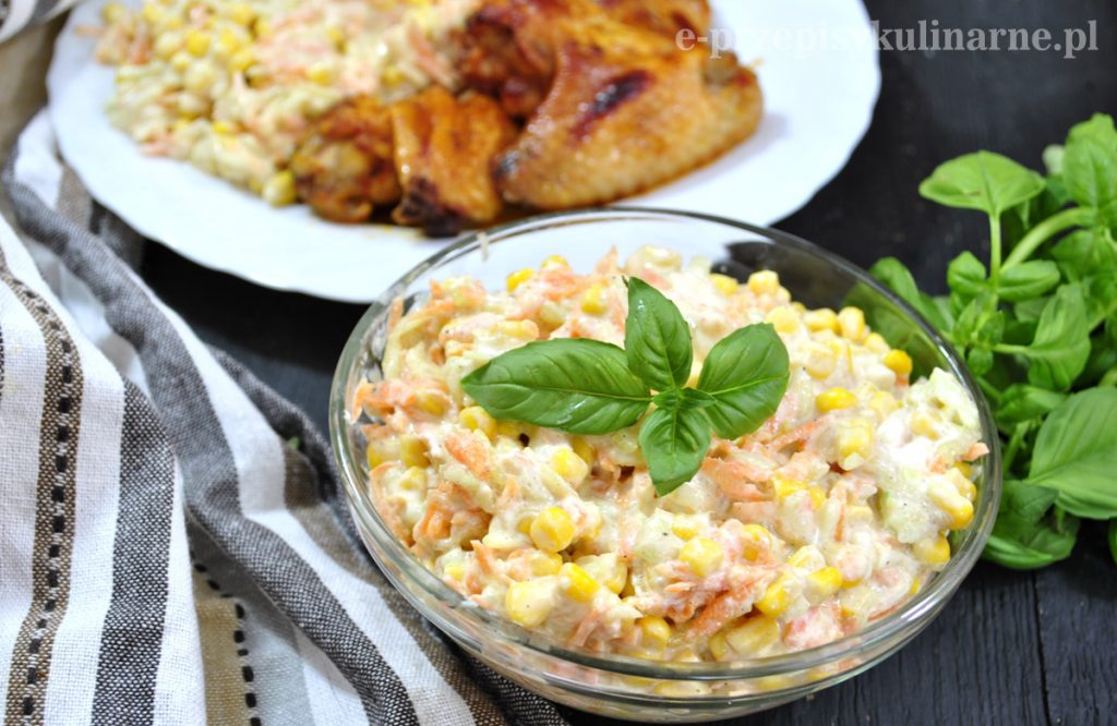 Marchewki i ogórki obieramy i ścieramy na tarce o grubych oczkach. Kukurydzę odsączamy. Składniki przekładamy do jednej miski, dodajemy przyprawy, jogurt i majonez. Mieszamy dokładnie.