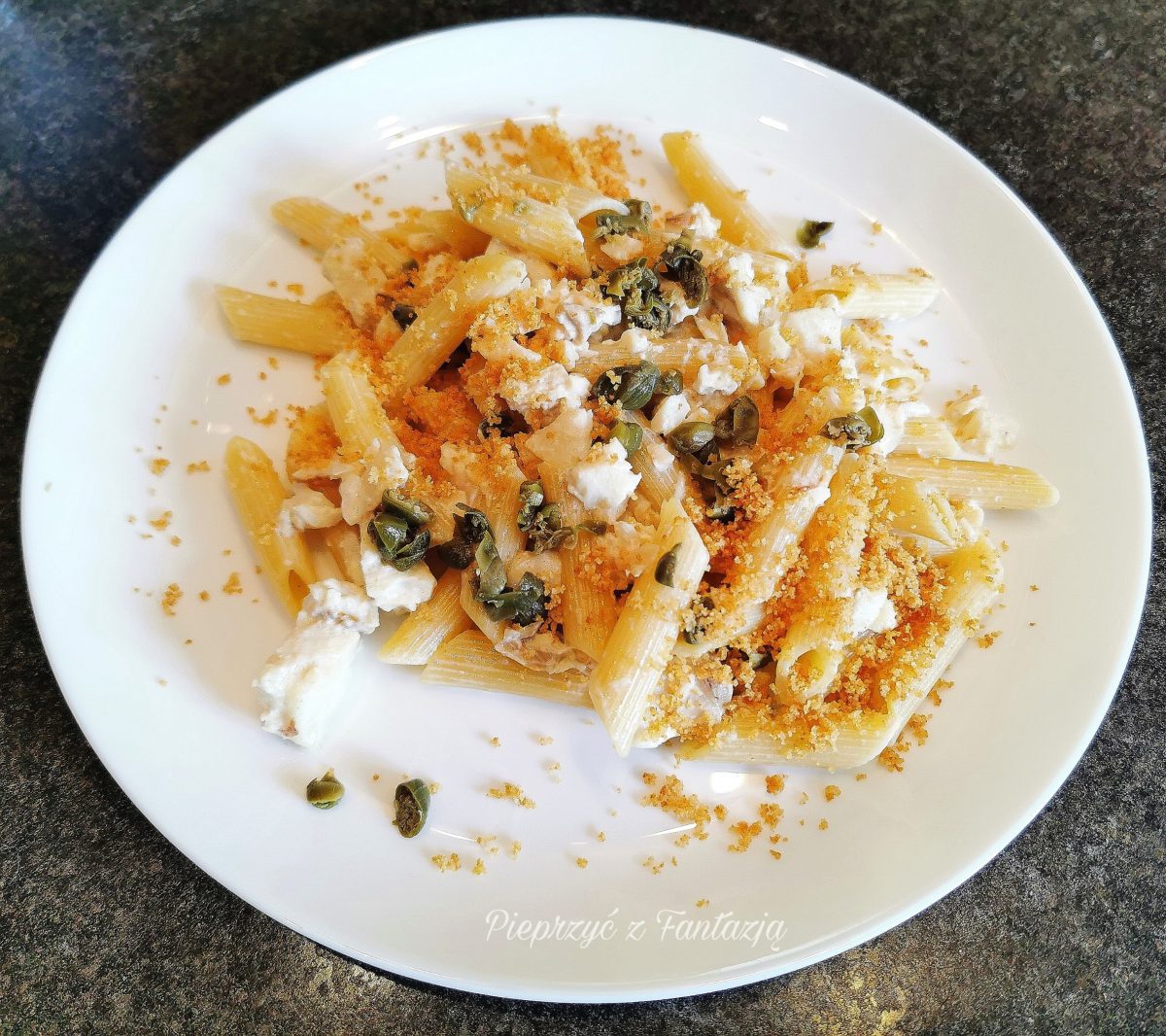 Makaron z dorszem w mleku pod pierzynką z bułki tartej