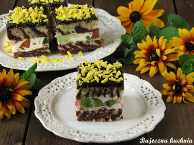 Moi domownicy bardzo lubią zebrę więc postanowiłam ją nieco odmienić, przełożyłam ją masą śmietanową z galaretkami. Ciasto jest smaczne i ładnie się prezentuje, idealne do popołudniowej kawy.