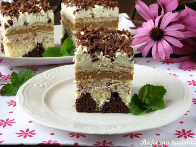 Bardzo smaczne i efektowne ciasto, przełożone pyszną masą śmietanową z posypką smaku batona Kit Kat oraz masą kajmakową. Po przekrojeniu bardzo ładnie się prezentuje biszkopt.