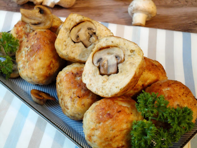 Klopsiki z mięsa drobiowego z bogatym wnętrzem są ciekawą odmianą klasycznych pulpetów. Pieczarka schowana w środku klopsika jest miłą niespodzianką i smacznym przełamaniem smaku mięsa.
