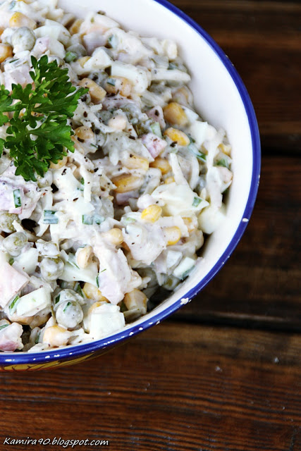 200 -300 g wędzonego kurczaka1 słoik selera konserwowego1 puszka kukurydzy i groszku firmy Jamar3 duże ogórki kiszone4 jajka1 mała porapieprz, sól4-5 łyżek majonezu1 łyżeczka ostrej musztardy