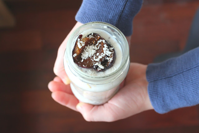 Nocna /z lodówki/ owsianka kokosowa z nasionami chia, podana z śliwką, wiórki…