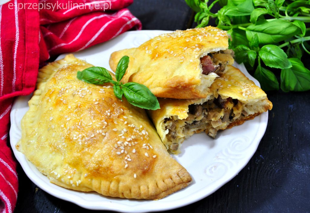 Przepis na smaczne pierogi pieczone z farszem z kiełbasy i pieczarek.