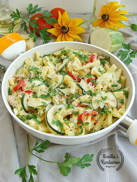 Uwielbiam takie obiady w 20 minut, parę sezonowych składników jak cukinia, makaron każdy lubi, wino zawsze znajdzie się w barku przecież i radzę z niego nie rezygnować bo wspaniale podkręca