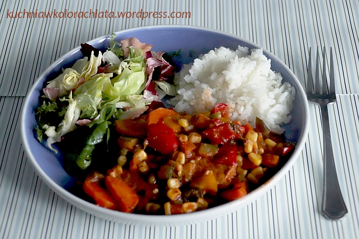 – polędwiczka wieprzowa (ok. 100 g),- 3 młode ziemniaki (ok. 210 g),- łyżeczka oleju rzepakowego (ok. 5 g),- 2 łyżeczki musztardy (ok. 20 g),- łyżeczka sosu sojowego, – sól i pieprz,- 3 liście sałaty (ok. 15 g),- 1 mały pomidor (ok. 100 g),- ¼ ogórka (ok.