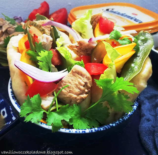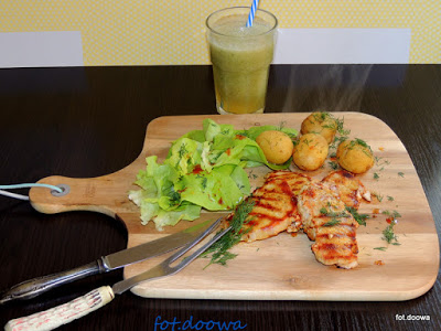 Szybki dressing do sałaty, w tym czasie schab się grilluje i młode ziemniaczki się gotują i mamy to.