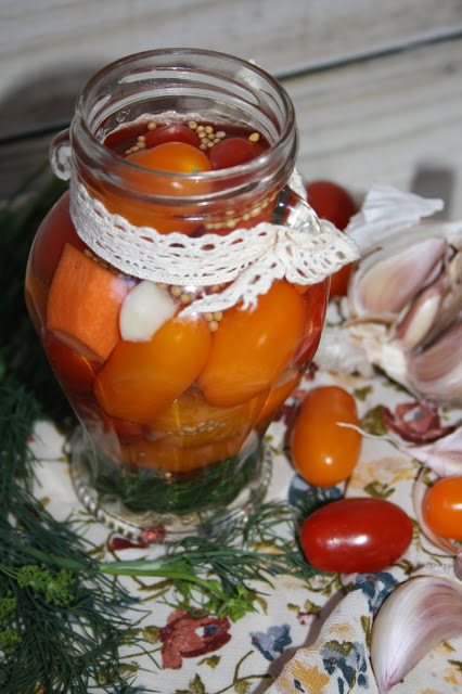 1 Kg pomidorków u mnie śliwkowe1 szklanka octu3 szklanki wody9 łyżek cukru2 łyżeczki soli2 marchewki5 ząbków czosnkudo każdego słoiczka:2 liście laurowe2 ziarna ziela ang2 ziarna pieprzułyżeczka gorczycyWykonanie:Wodę zagotować z octem,