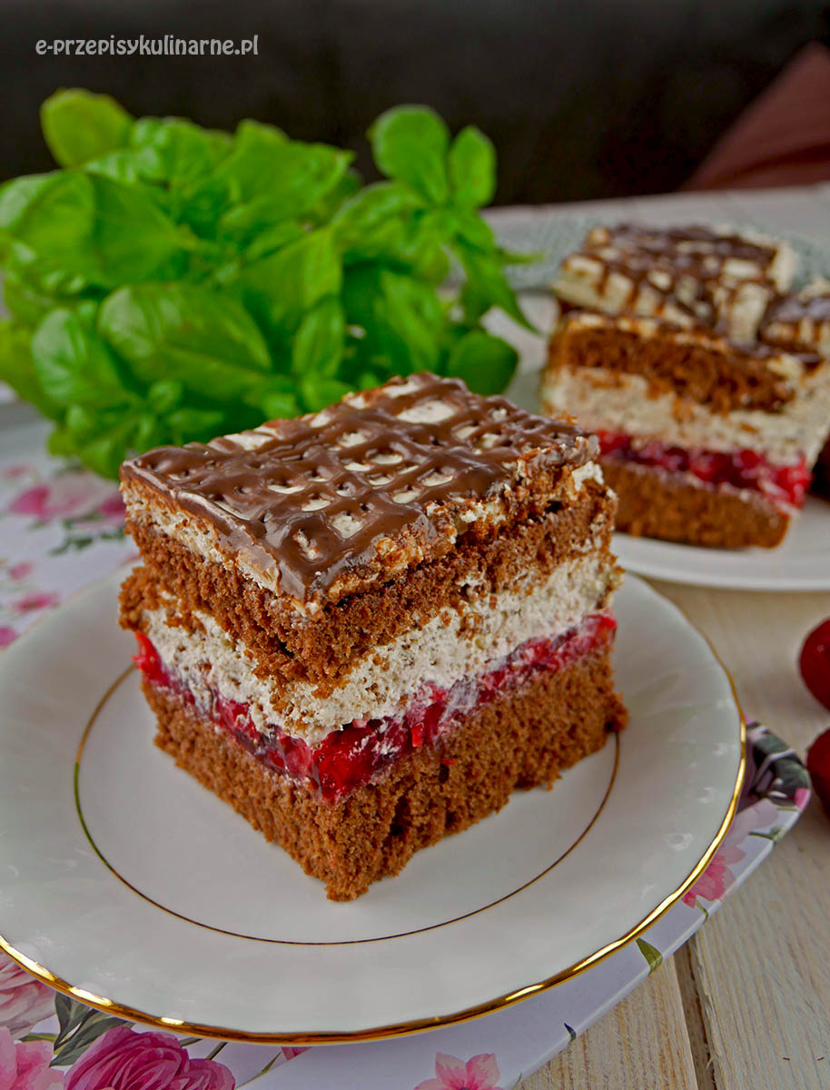Ciasto Książę z Bajki składające się z ciemnego biszkoptu przełożonego galaretką z…