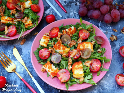 Sałatka z rukolą, smażonym serem halloumi oraz pomidorkami koktajlowymi i czerwonymi winogronami,…