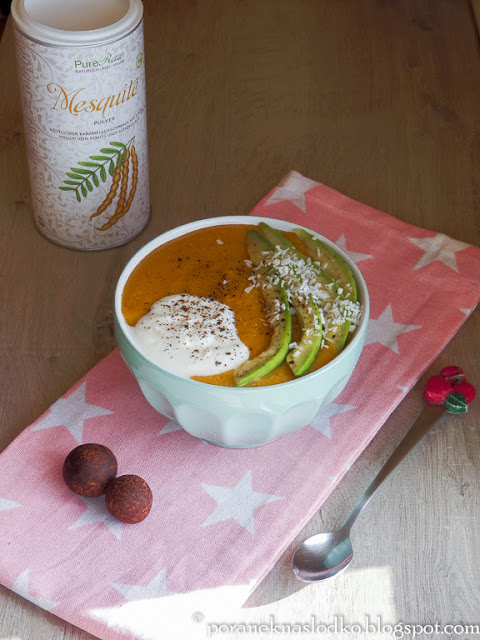 Wegański budyń dyniowy na mleku migdałowym podany z mleczkiem kokosowym, awokado, wiórkami…