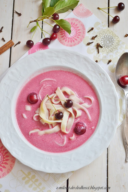 Lato w pełni, warto więc korzystać z jego owoców… Dziś mam dla Was przepis na pyszną zupę z wiśni. Ja podaję ją na zimno, jako chłodnik, z dodatkiem ugotowanego makaronu, ale oczywiście można ją również podawać na ciepło. Pyszna, aromatyczna, lekko słodka. Tylko zajadać 🙂