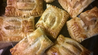 Ciasto dzielimy na 8 prostokątów, na jednej połowie kładziemy jabłka, drugą nacinamy w 3 miejscach, składamy na pół, sklejamy dociskając widelcem. Wierzch smarujemy jajkiem (można posypać cukrem). Pieczemy ok. 20 minut.
