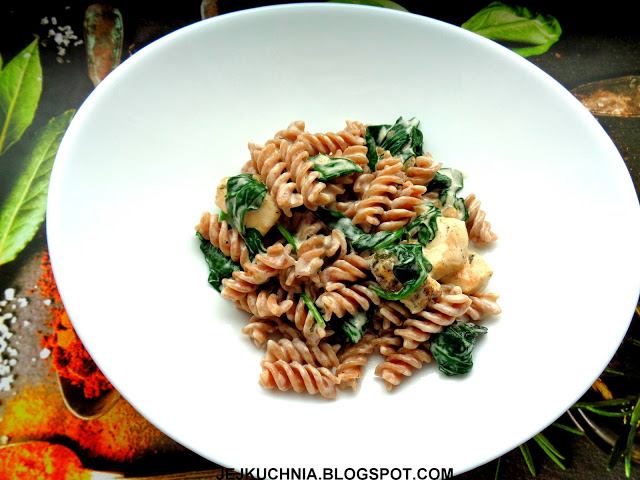 MAKARON PEŁNOZIARNISTY Z POLĘDWICZKĄ KURCZAKA I SZPINAKIEM