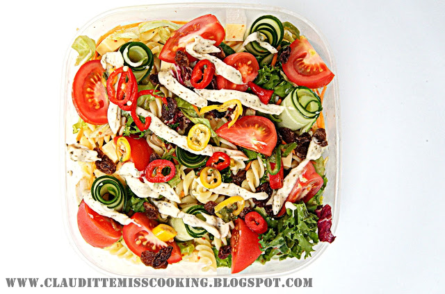200 g mix sałat4 pomidorki (lub jeden duży malinowy, ja użyłam pomidorków z działki mojego taty)garść sera gouda pokrojonego w kostkę1/2 ogórka250 g makaronu MALMA FUSILLI1 łyżka kolorowej papryczki chilliłyżka posiekanego lubczyku1 łyżka przyprawy- suszone pomidory z czosnkiem i bazylią6 łyżek oliwy z oliwek2 łyżki octu