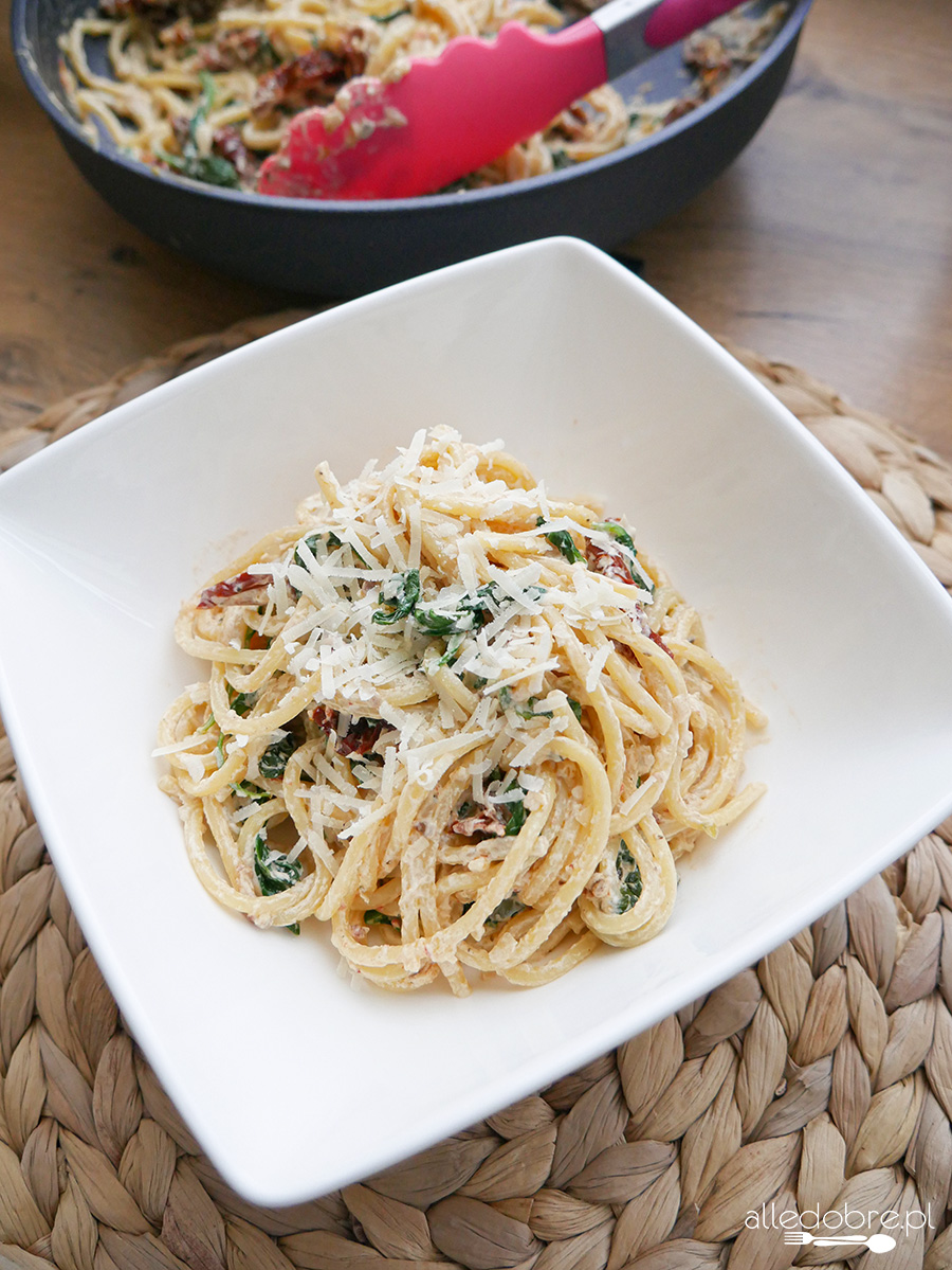 Składniki: 150 g makarony, u mnie farfalle 2 białe kiełbasy 1/2 czerwonej…