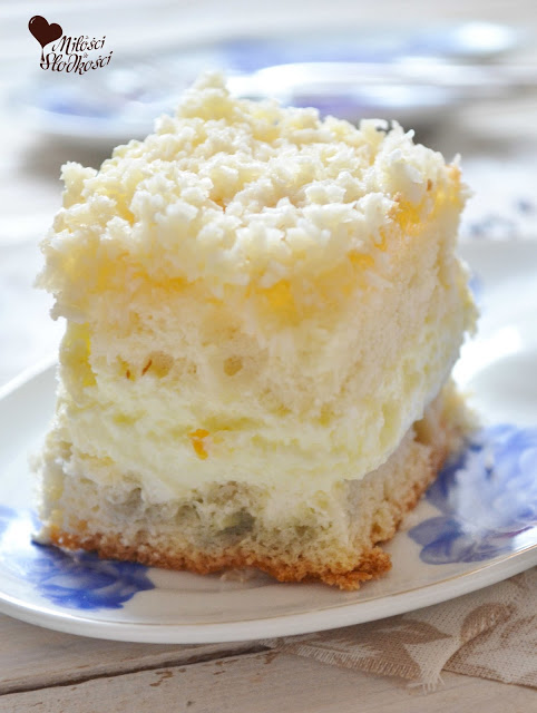 Nareszcie weekend! A co za tym idzie, czas na niedzielne ciasto. Dziś proponuję coś odrobinę bardziej pracochłonnego. Lekki biszkopt, krem serowo-śmietanowy oraz słodka warstwa z dżemu i kokosowej posypki. Smacznie, słodko, w sam raz do niedzielnej kawki 🙂